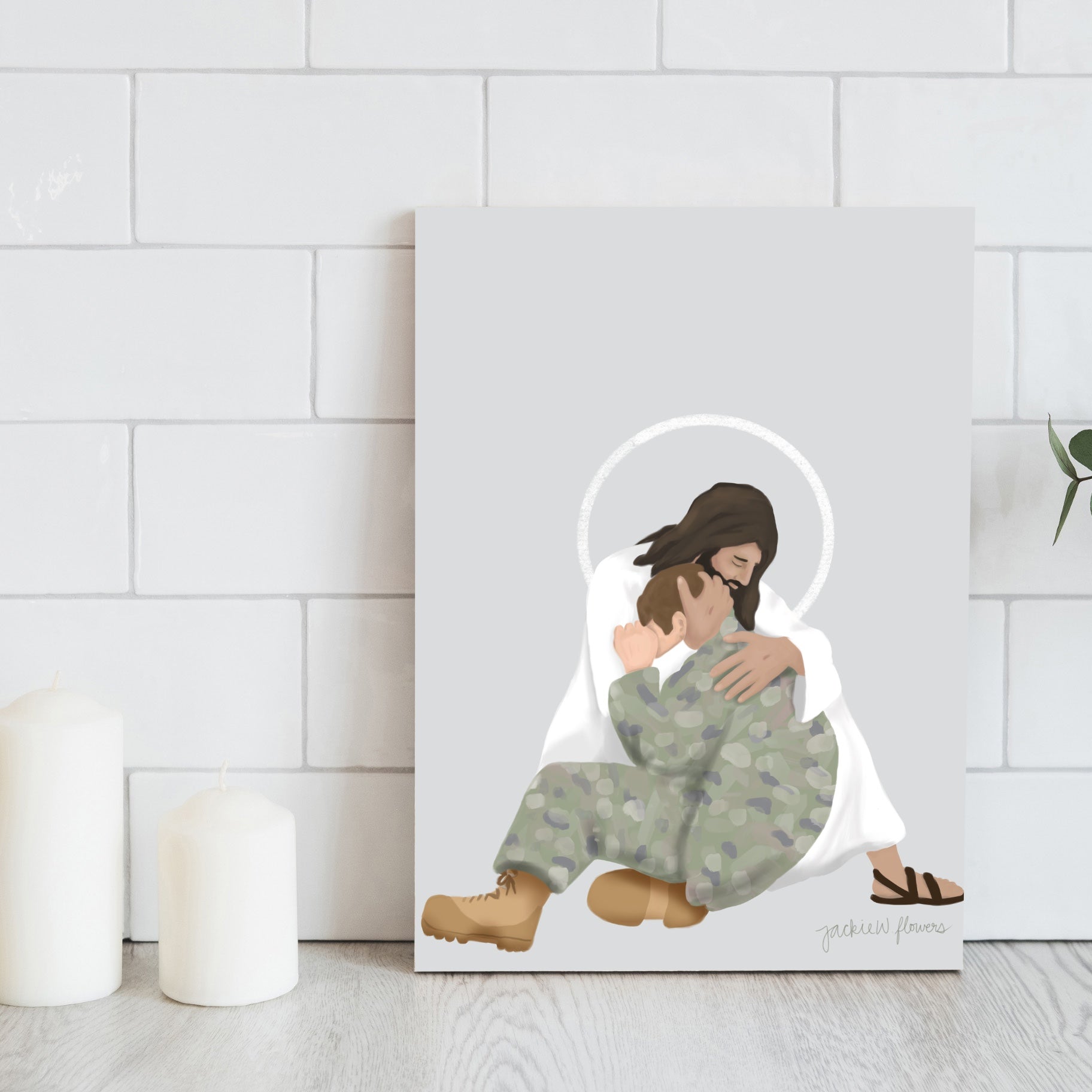 Perfect as a gift for a military wife, veteran, or Christian family, this painting brings encouragement to homes, offices, or churches. It serves as a daily reminder that Christ walks with us through every trial, offering comfort, healing, and unwavering love. A beautiful way to honor faith, service, and sacrifice.