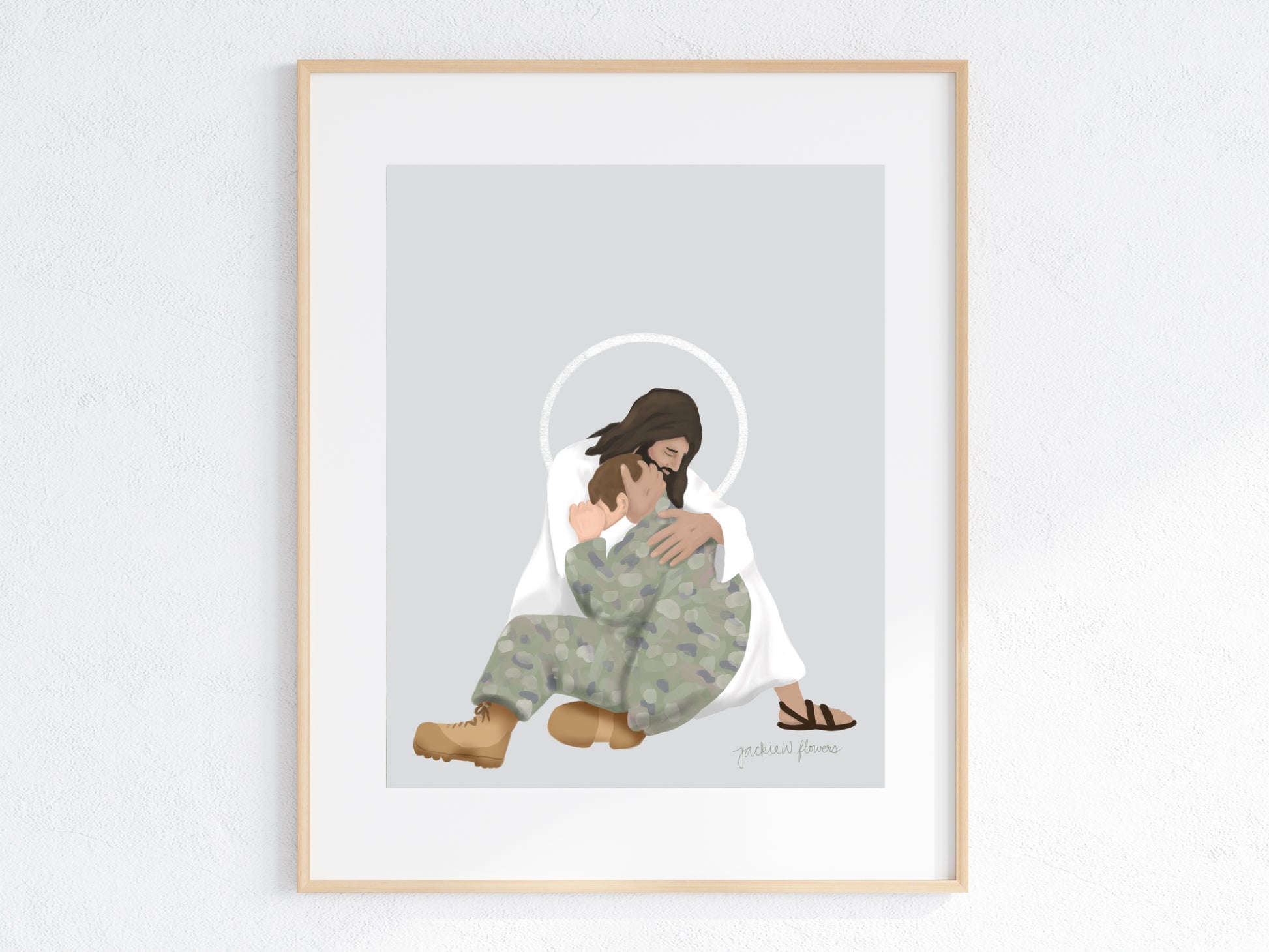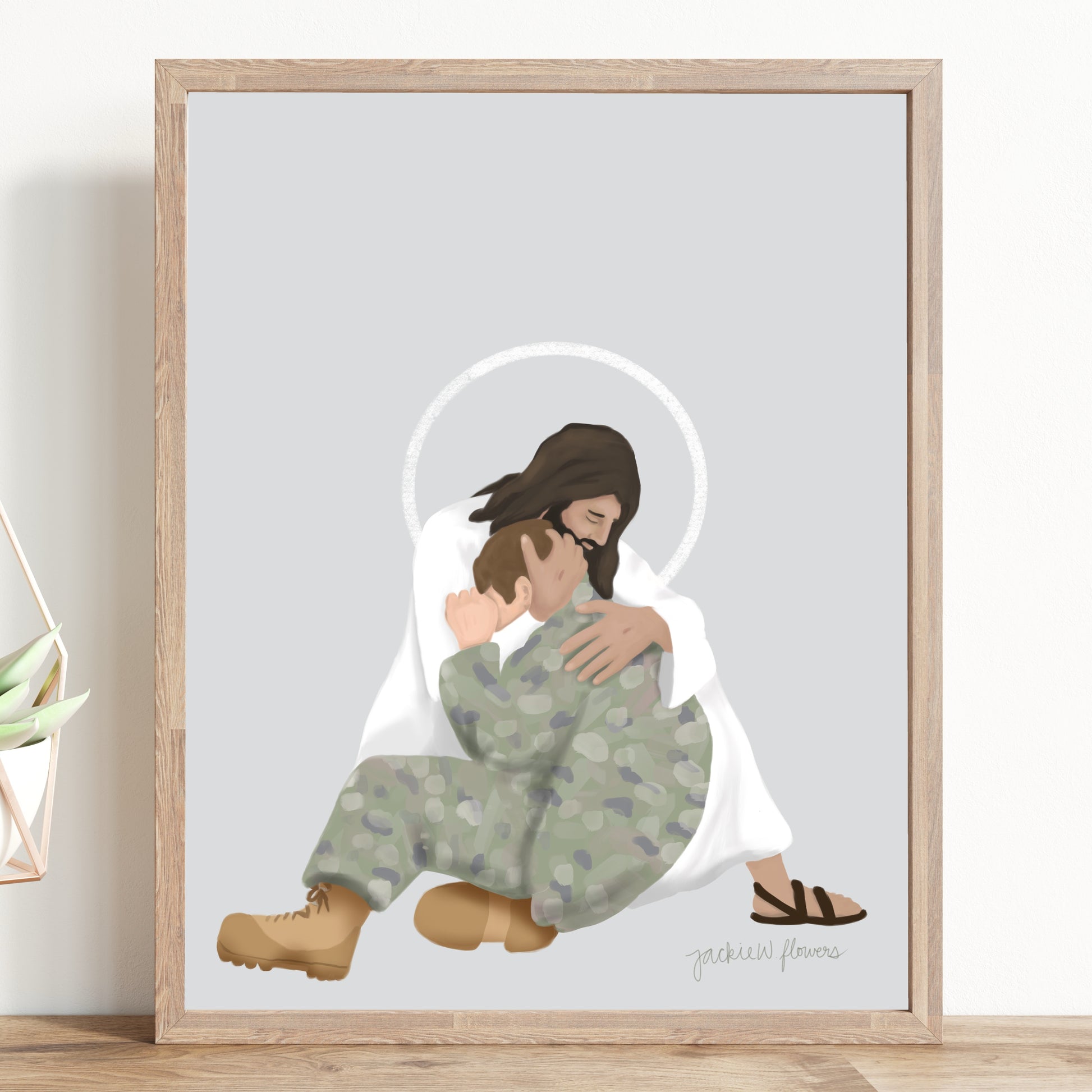 This inspirational Christian artwork depicts Jesus comforting a distressed soldier, a moving reminder of faith, strength, and peace in difficult times. With a soft light gray background and tender detail, this illustration offers hope and reassurance, making it a meaningful piece for military families, veterans, and those who carry the weight of service.